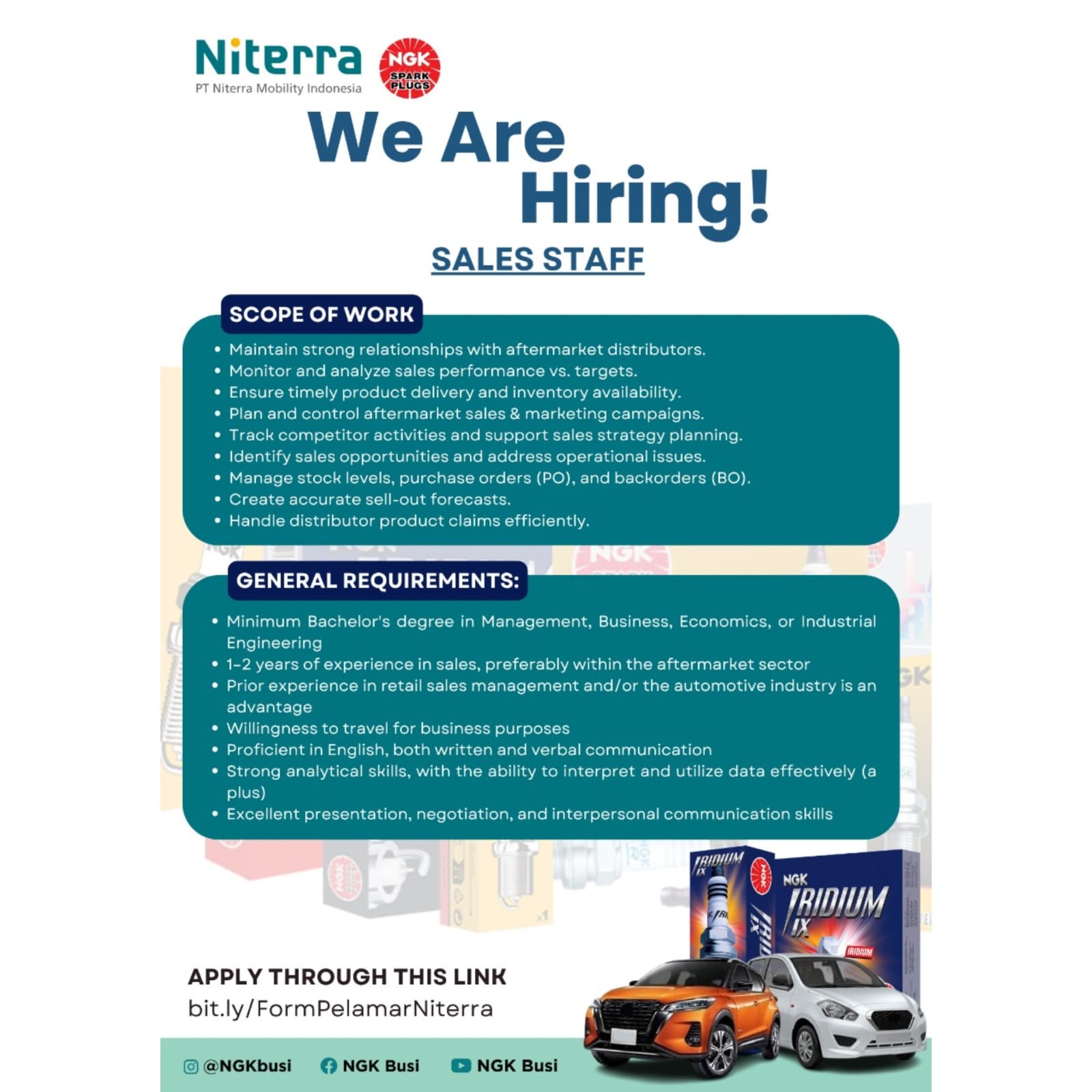 Saat ini terdapat PELUANG KARIR dari PT Niterra Mobility Indonesia, PT Prima Karya Sarana Sejahtera (PKSS), PT Ciptajaya Sejahtera Abadi, PT Agro Boga Utama, PT Berca Hardayaperkasa, PT Indomarco Pristama dan Adira Finance