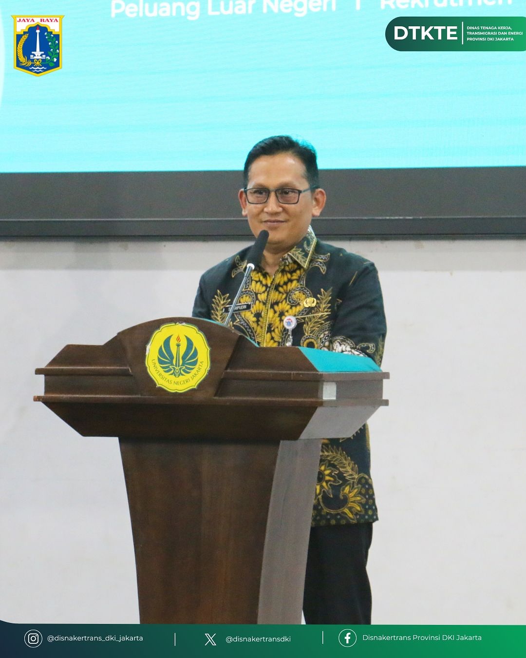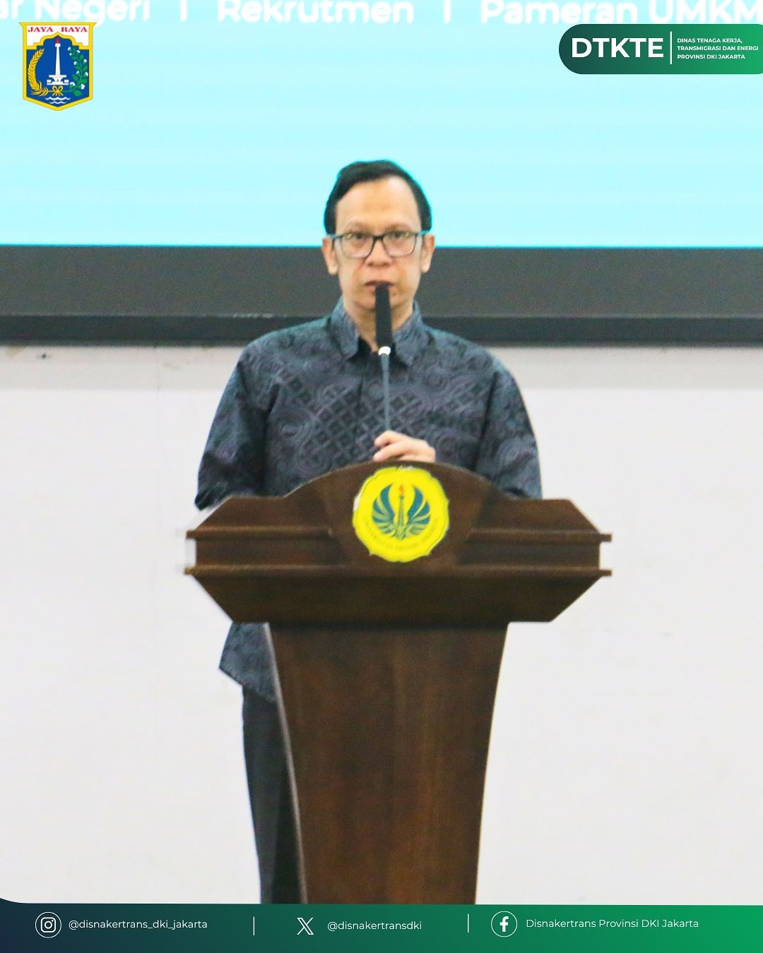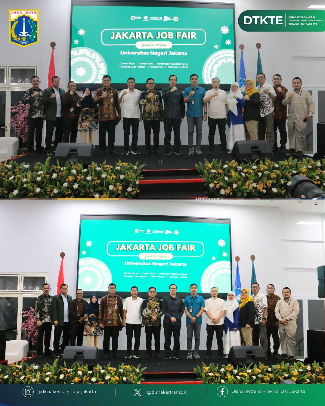 Kamis, 23 Oktober 2025, Bertempat di Functional Hall - Lantai 3 GOR UNJ Kampus B Rawamangun, acara Jakarta Job Fair Goes to Campus Universitas Negeri Jakarta secara resmi di buka. Kegiatan diselenggarakan oleh Dinas Tenaga Kerja, Transmigrasi dan Energi Provinsi DKI Jakarta dengan berkolaborasi bersama Universitas Negeri Jakarta.